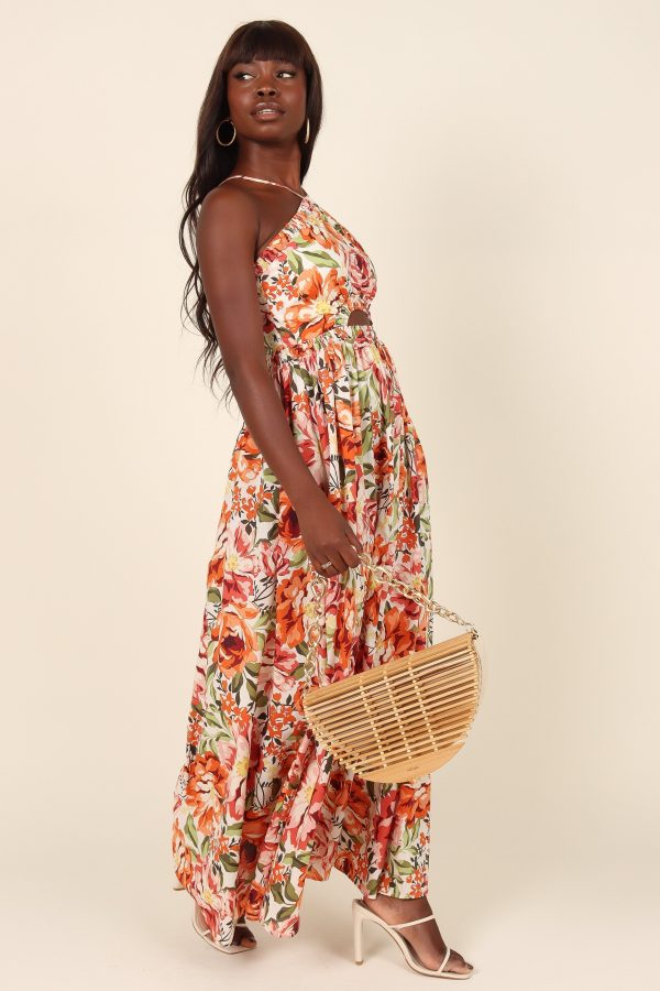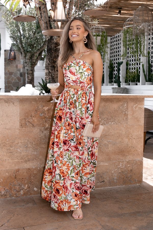 Meet our playful yet trendy Madeira Dress! With its captivating orange floral print. flirty halterneck. and cute cut-out detail under the bust. you’re in for a trendy twist. Its shirred elasticised waistband and handy pockets add a dash of practicality to this fashion-forward piece.