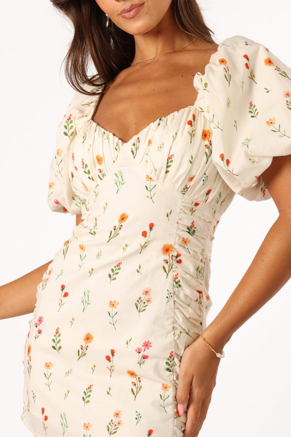 Twirl in the sunshine and ignite your playful spirit with our mini-length dress. featuring a flirty sweetheart neckline. The short sleeves with elasticised cuffs and shoulders keep the vibe breezy. while the back remains sleek with an invisible zip and hook-eye clasp.